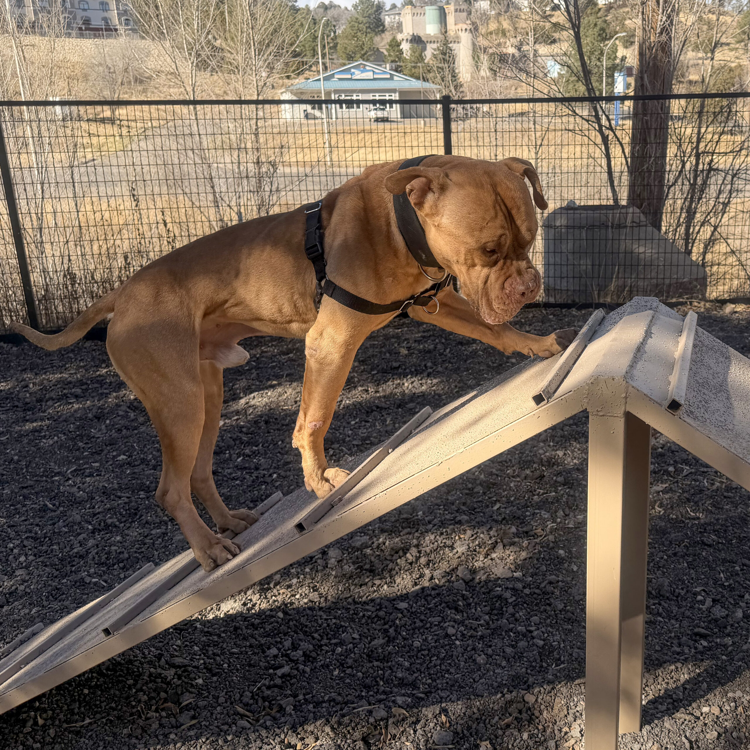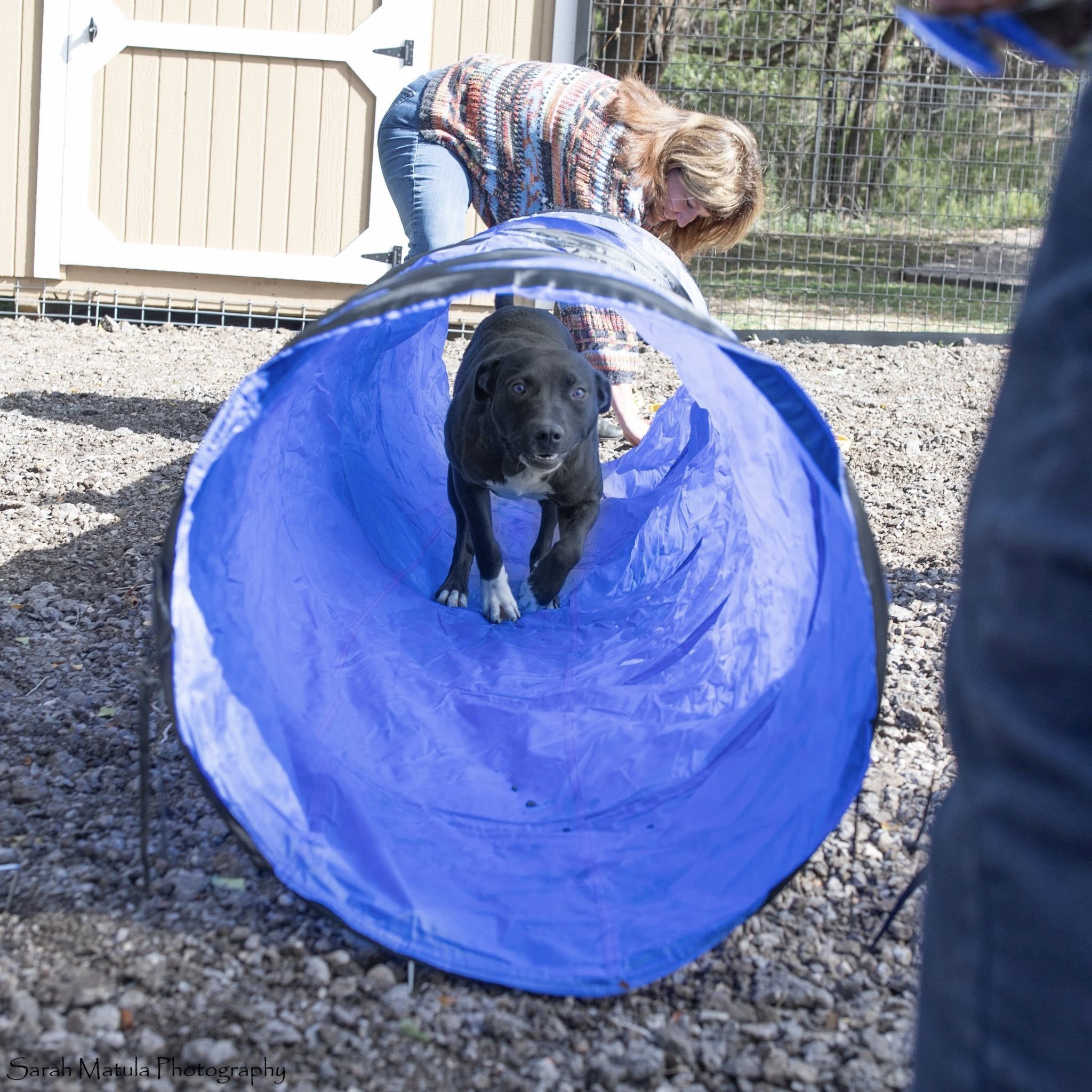 The course is used as part of our daily enrichment and conditioning efforts, helping dogs develop important skills such as focus, balance, and socialization. These activities not only improve their overall quality of life but also increase their chances of successful adoption by preparing them for life in a home environment.